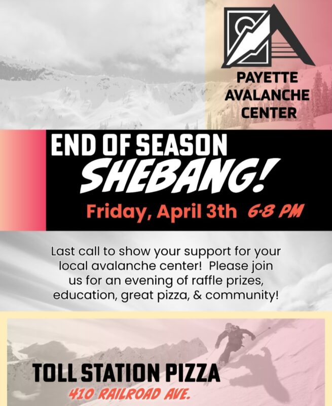 This Friday we are having our end of season party, “Shebang” at Toll Station Pizza in McCall. Come join us from 6-8pm for great pizza, raffle prizes, quick education, and community bonding…see you there.